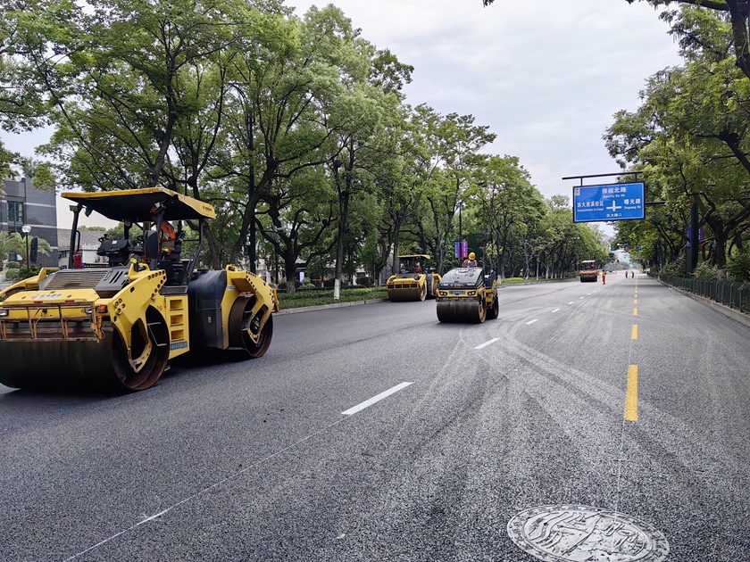 為保證施工順利進行,確保完成節(jié)點目標(biāo),環(huán)北天目指揮部克服工期緊、任務(wù)重、交通流量大、中高考期間無法施工等諸多困難,充分發(fā)揮“能吃苦、能戰(zhàn)斗”的鐵軍作風(fēng),嚴格落實施工單位采取多種措施加大人員力量、機械設(shè)備投入。充分利用半夜12點后車輛較少的時間段,現(xiàn)場協(xié)調(diào)指揮解決施工推進中存在問題。最終克服雨季等不利條件,搶抓晴好天氣,高效有序完成了全部瀝青攤鋪施工。