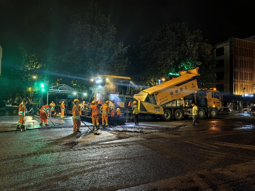 作為重要的東向西道路,環(huán)北天目工程現(xiàn)狀交通壓力大,交通導(dǎo)改難度高,道路瀝青面層攤鋪施工多安排在凌晨開展。